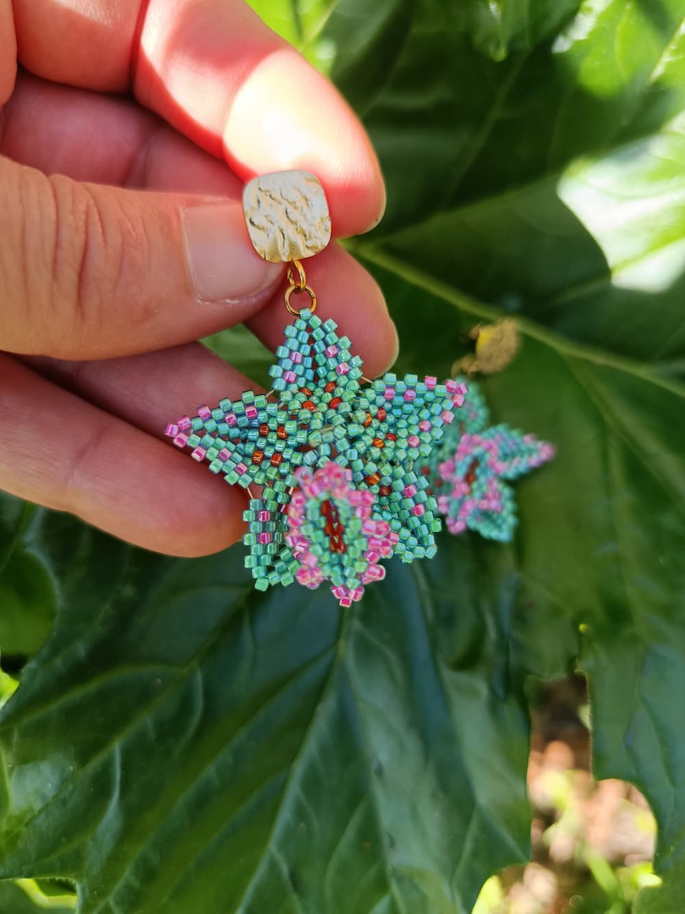 - Boucles d’oreilles en tissage de perles de verre créés et tissées au fil et à l’aiguille par mes soins